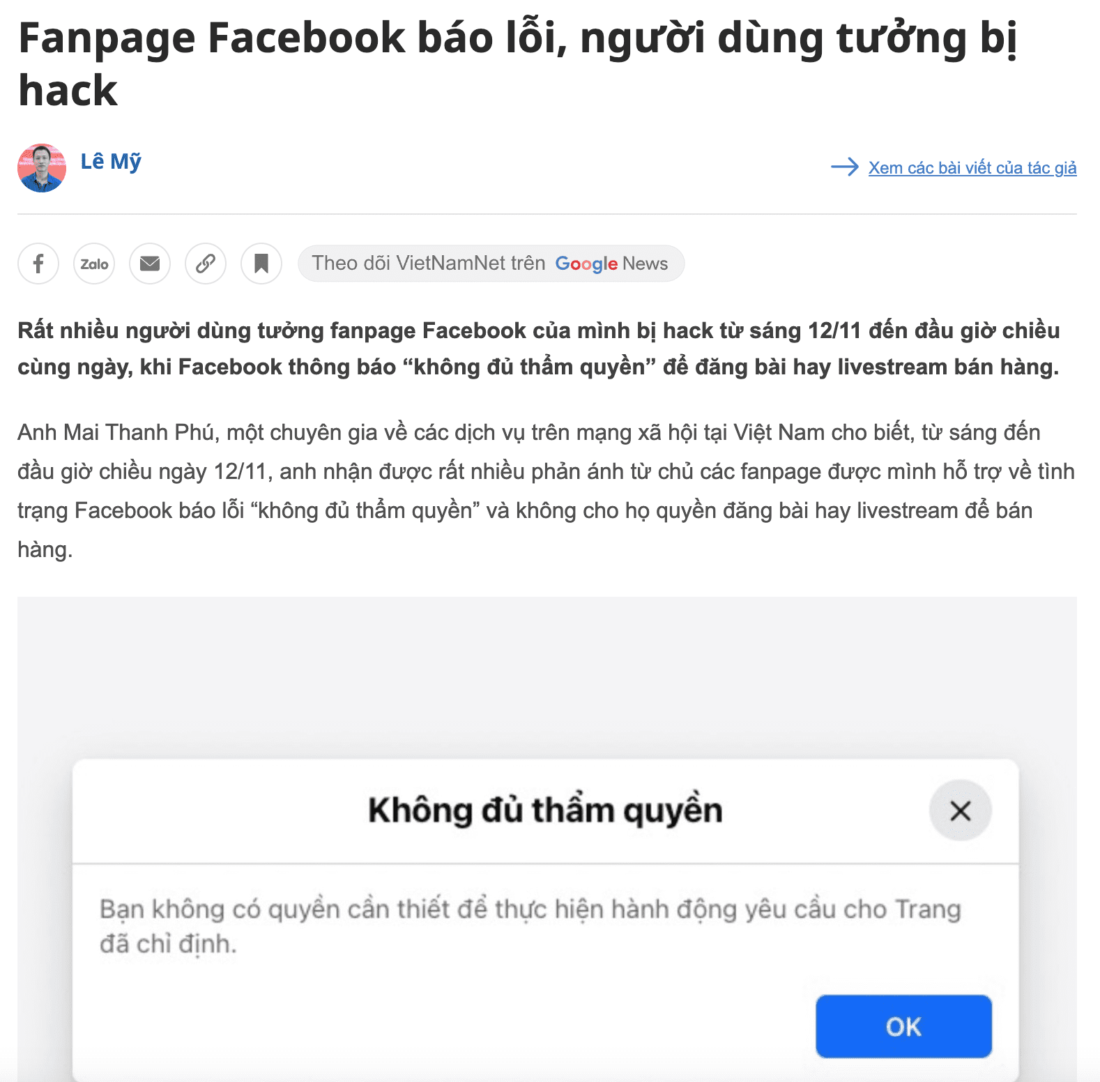 Rất nhiều người dùng tưởng fanpage Facebook của mình bị hack từ sáng 12/11 đến đầu giờ chiều cùng ngày, khi Facebook thông báo “không đủ thẩm quyền” để đăng bài hay livestream bán hàng.