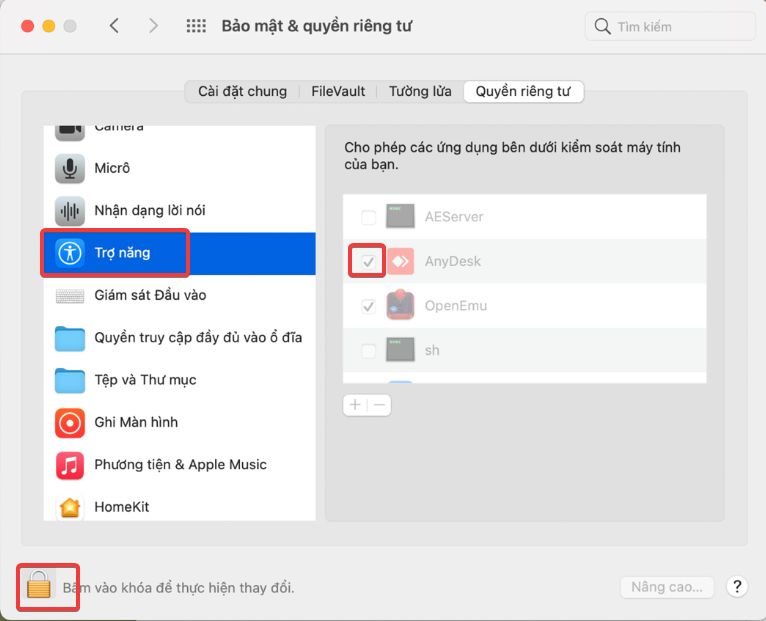 Bước 4: Chọn thẻ “Trợ năng” (Accessibility). Nhấn nút “Mở khóa” (Unlock) và đánh dấu chọn vào ô trước ứng dụng Anydesk.